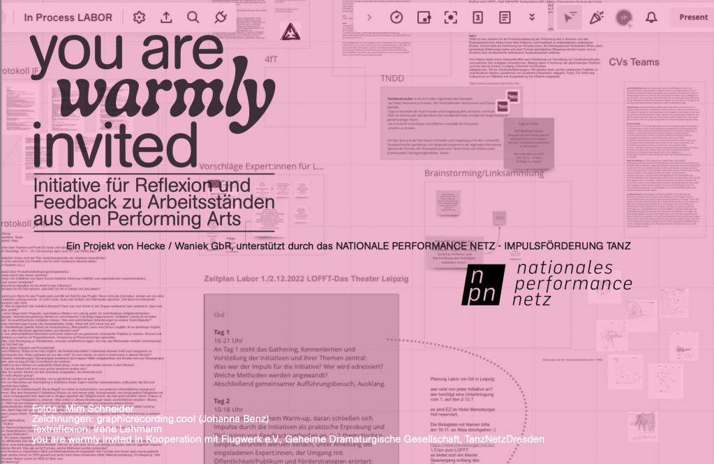 Labor von ›In Process‹ eines Netzwerkprojektes von den Iniativen ›you are warmly invited‹, ›Geheime Dramaturgische Gesellschaft‹ (Thüringen), ›Flugwerk‹ (Berlin) und ›TanzNetzDresden‹, die sich mit der Öffnung von Arbeitsprozessen, Feedbackformaten und Publikumsinvolvierung auseinandersetzen. Es wurden neue Formen der Zusammenarbeit, Empowerment, Communitybuilding und Kulturpraktiken des Teilens erprobt sowie die Rollen als Ermöglicher:innen von Austausch, Begegnung und Kunst verhandelt.